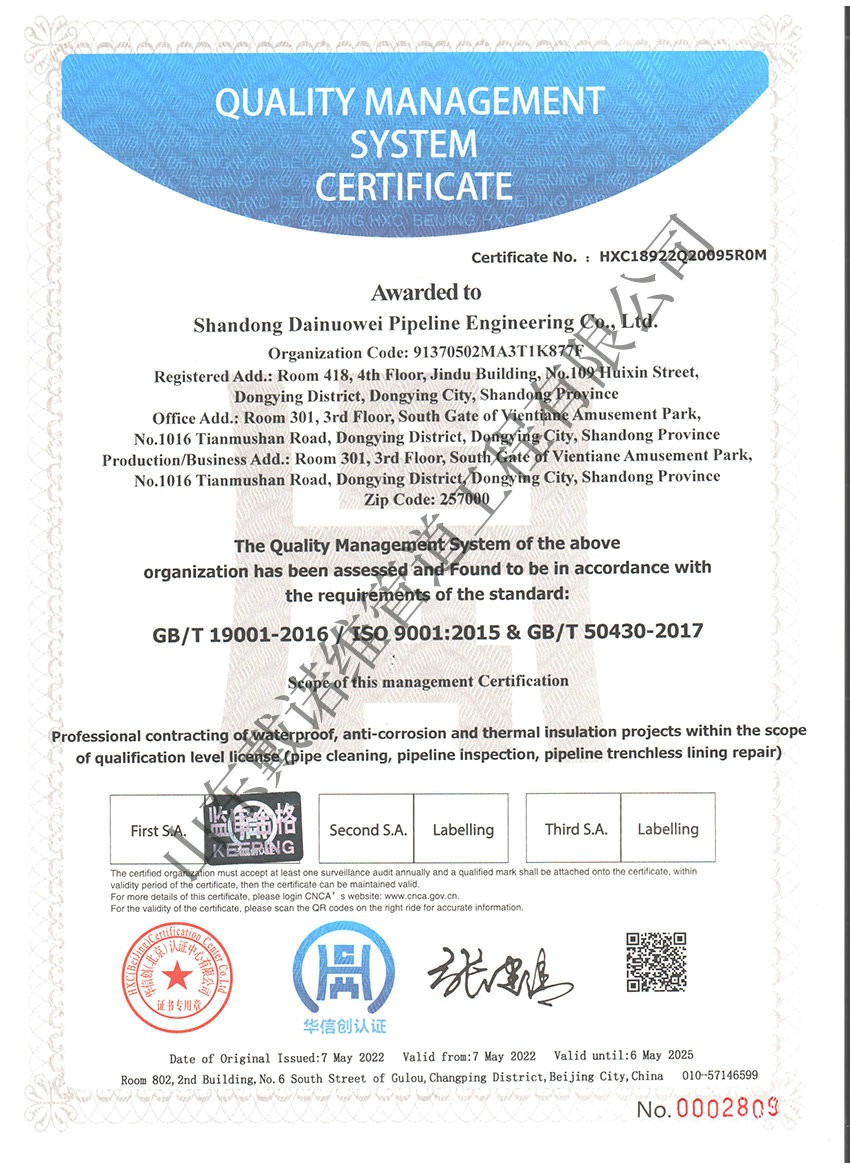 管道非開挖修復(fù)工程服務(wù)企業(yè)資質(zhì)證書